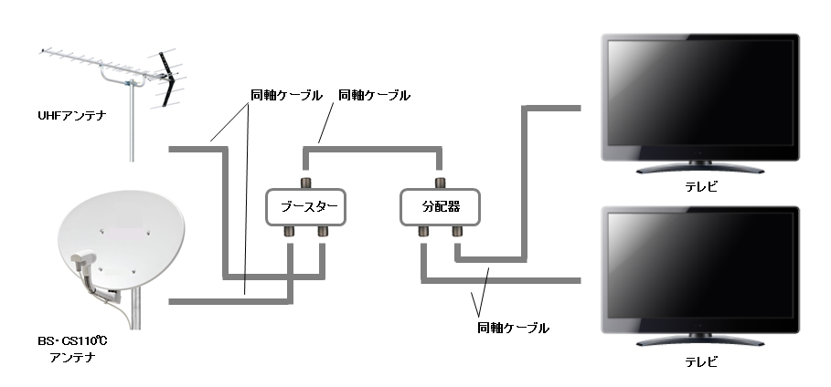 分配器は簡単に自分で取り付けることが可能です。しかし、分配数が増えると、減衰が大きくなり、最悪の場合、アンテナからの電波が減衰することで、テレビを見ることが出来なくなる場合があります。この場合は、ブースターの設置が必要になります。 ブースター取付(設置)や調整は、テレビで受信できる電波の強さ等を測定しながらの調整が必要になる場合があります。この場合は、近くの電気屋さんや専門業者に依頼するのがおすすめです。 ]]>