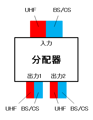 分配器はアンテナ側からのケーブルを入力端子に接続し、出力端子をテレビと接続します。接続は全て同軸ケーブルにて行います。