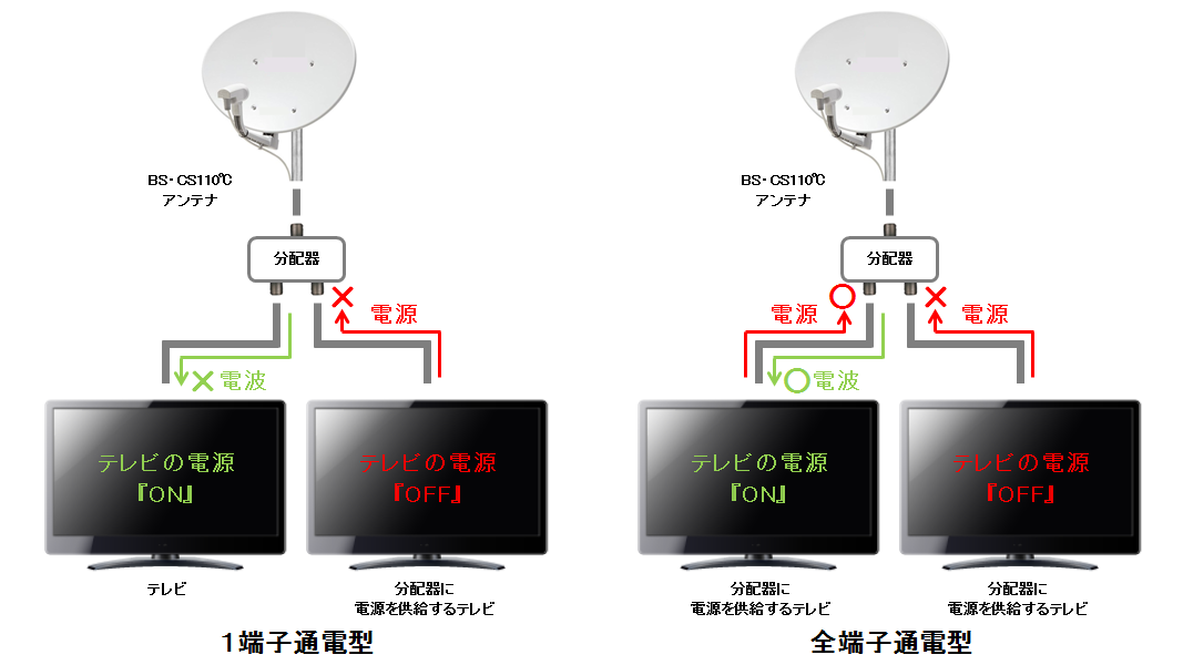 1端子通電型の分配器は、接続している1台のテレビからのみ電源供給が可能です。電源供給側のテレビの電源をOFFにすると、分配器に電源を供給できなくなるため、もう一方のテレビでアンテナからの電波を受信することができなくなります。