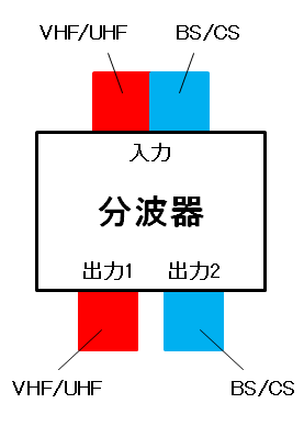 分波器とは、「電波の種類別に分ける」機器です。アンテナが受信した電波信号は様々な電波が入り混じっています。この電波を分波器が周波数ごとに「VHS」「UHF」(地デジ放送)と、「BS」「CS」(衛星放送)の2つに分けて出力します。 一般的なテレビは、放送を見るための入力端子が「地デジ」「衛星放送」の2つに分かれています。しかし1本のアンテナ線に全ての電波がまとまっている場合、そのままでは端子に接続することができません。そこで分波器を使用し、テレビの端子に合わせて電波を分けることで放送を見ることができるようになります。 他の部屋のテレビ端子から分配器を使って伸ばしたアンテナ線に分波器を接続し、テレビに繋ぐことも可能です。