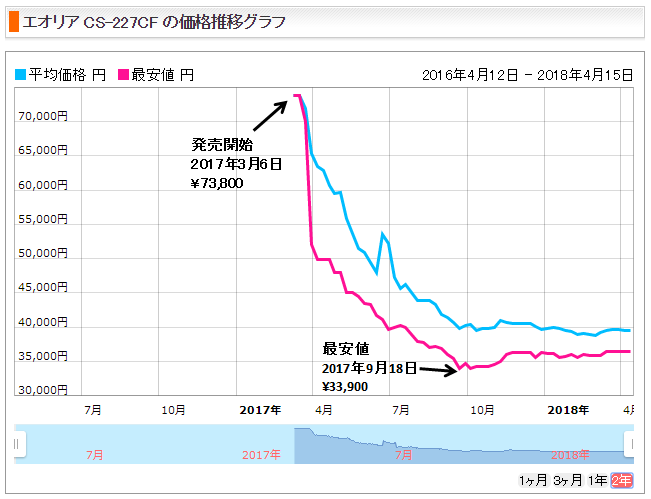 エアコン(クーラー・暖房)製造メーカは、パナソニック・三菱電機・ダイキン・日立・東芝が市場シェアの大部分を占めています。特に、最近ではパナソニック製のエアコン(クーラー・暖房)が、多くの市場シェアを占めていると言われています。 今回は、このパナソニック製のエアコン(クーラー・暖房)が、新製品発売時期から、どのような価格変動になっているかを調査してみました。 調査は、インターネット上で、商品の価格を簡単に比較できる『価格.com』のデータを調べてみました。パナソニック製 エオリア CS-227CFの価格推移グラフ