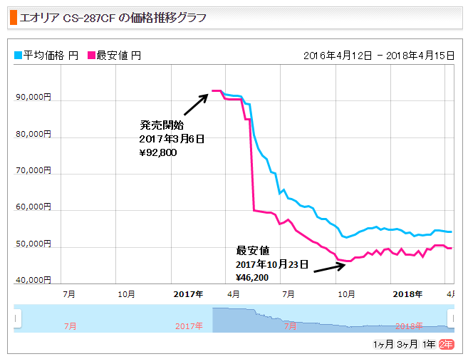 このグラフでは、2017年3月6日に発売された『パナソニック製 エオリア CS-227CF』は、発売当初の価格が、73,800円でした。その後、価格は下落を続け、2017年9月18日に最安水準の、33,900円となり、その後、概ね横ばいの価格推移をしましています。 販売価格は、発売後間もない時は、価格が最も高く、発売後6カ月程度で最安水準になり、その後、急激な価格上昇が無く、横ばいの状態になっている事が分かりました。 これは、夏が終わり、クーラーの需要が落ち込む9月に、最安水準になった結果であると推定できます。従って、新製品発売前と合わせて、夏が終わる9月もエアコンが安い時期であることがわかりました。 エオリア CS-287CF の価格推移グラフ