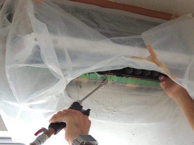 フィン掃除の際は、塗布する薬品がその他の部品にかからないようにビニールでその他の部品を覆う必要があります。また、薬品が排水(ドレン)に流れないで室内にも落ちてきます。薬品でエアコン周りが汚れないように、薬品が漏れ落ちる前側もビニールで覆う必要があります。 電気屋さんや専門の掃除業者等にお願いすると、掃除用のコンプレッサーから吐き出される高圧の水で洗浄してくれます。